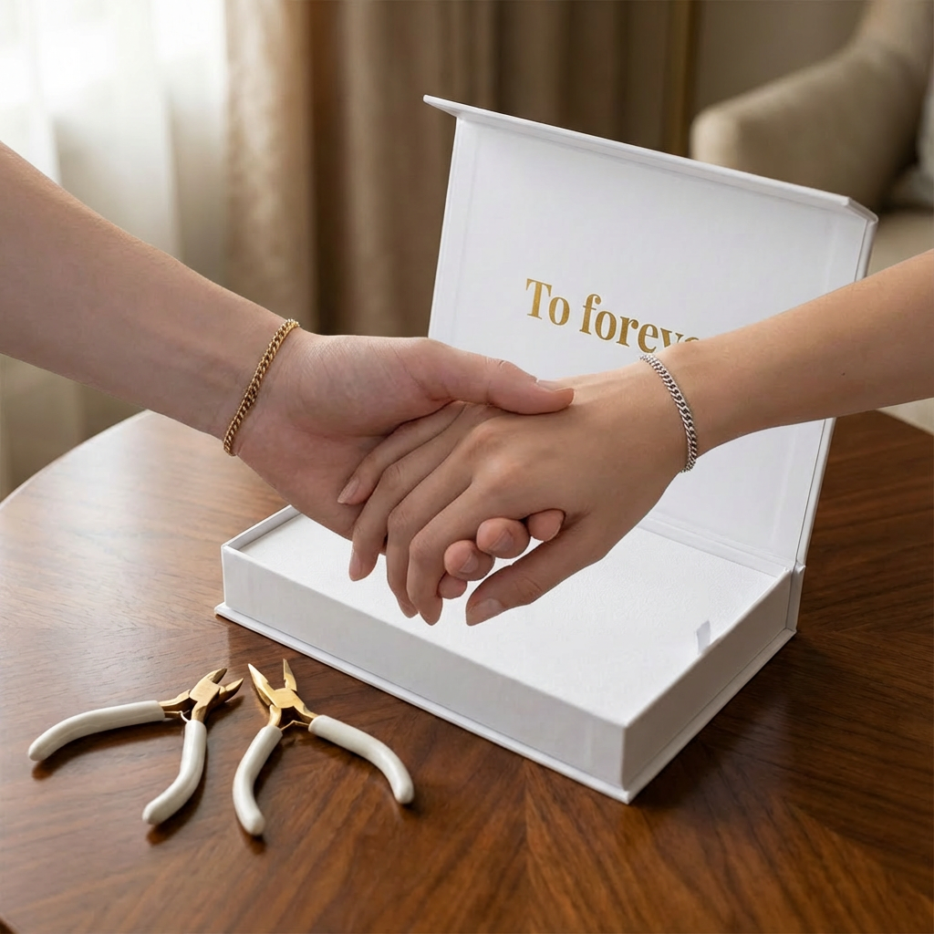 - 🔗 Permanent–style closure — a stay–on symbolic bracelet you attach to each other